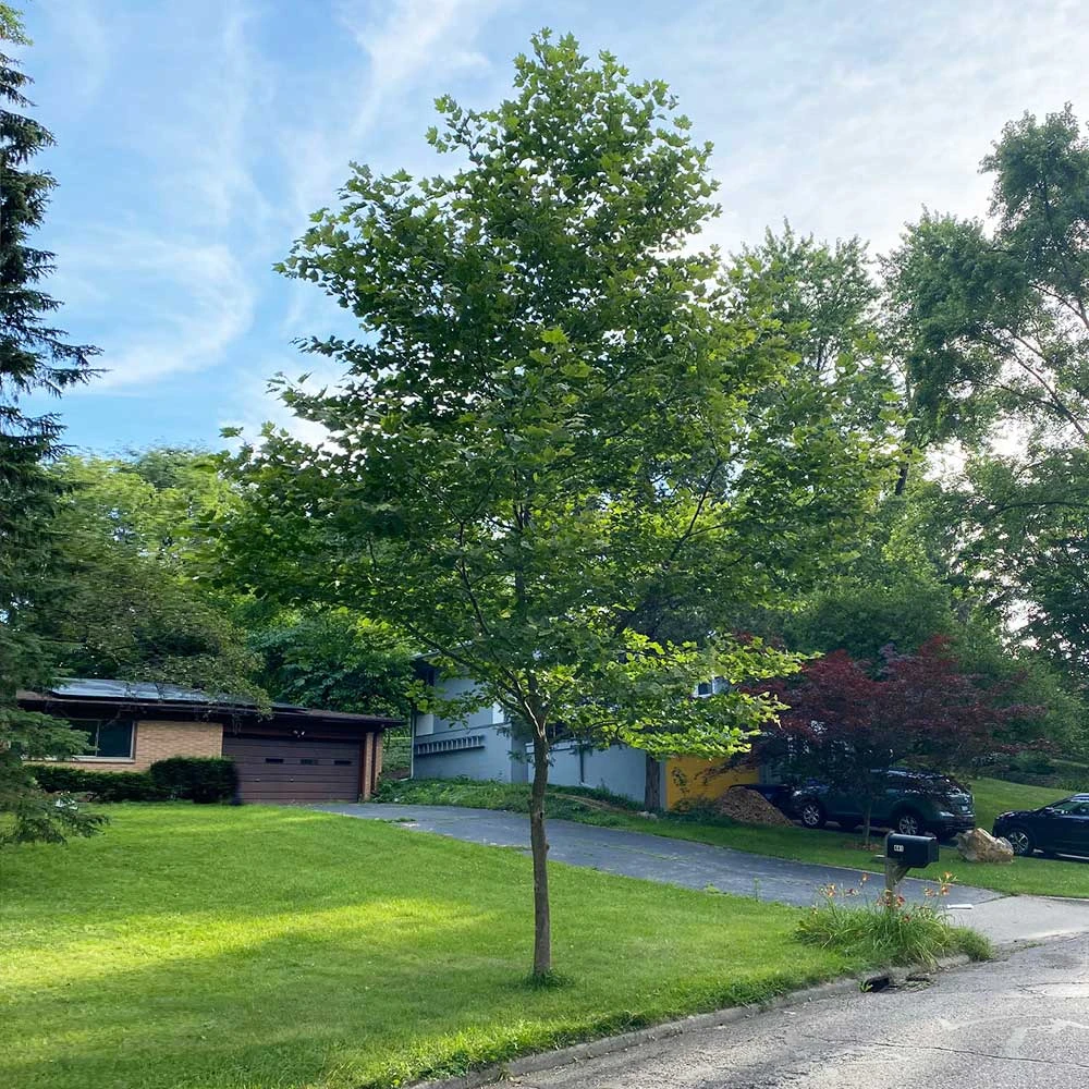 A tidier relative of the classic Sycamore, the EXCLAMATION! London Planetree doesn’t drop seed pods, so you can enjoy its regal presence without the mess. The EXCLAMATION!™ can reach an impressive 50-60 feet in height, and with a growth rate of about 3 feet per year, it quickly establishes itself as a mature shade tree.